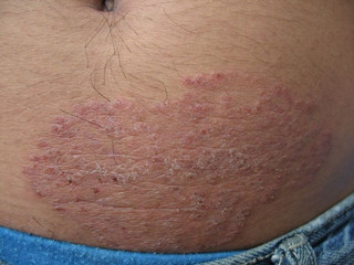 2、初于股上部内侧出现小片红斑,其上有脱屑,并逐渐扩展而向四周蔓延,边界清楚,其上有丘疹、水疱、结痂。